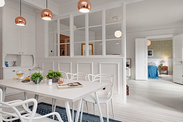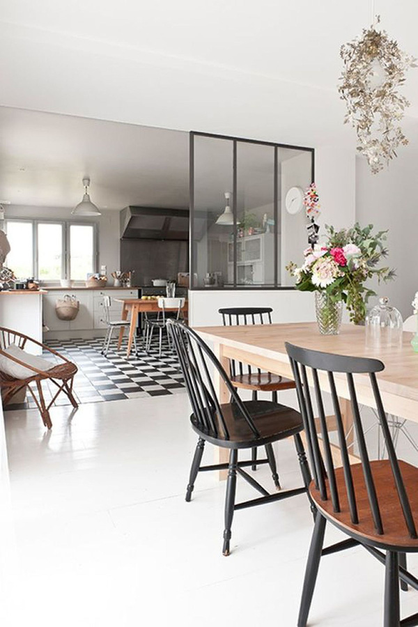 Một vách ngăn bằng kính bán phần như thế này là một lựa chọn sáng suốt để phân cách giữa không gian phòng khách và nhà bếp.